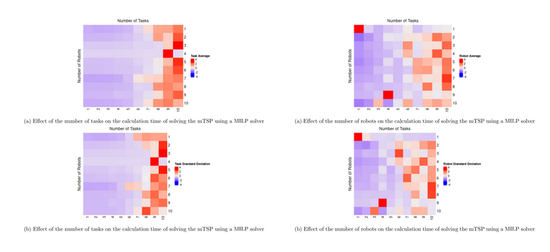 The MILP solver consistently generated optimal schedules across all tested cases, validating its role as a reliable benchmark for multi-robot task allocation. However, the analysis showed that computation time increased super-linearly as the number of tasks or robots grew, with heatmaps revealing distinct inflection points where complexity rose sharply. While MILP guarantees optimal solutions, it does not scale well to larger swarms, making it impractical for real-time or large-scale deployments. The findings highlight the importance of alternative approaches, such as heuristic methods or neural network–based schedulers. This project not only provided a detailed characterization of MILP for MRTA but also established a baseline for comparing future algorithms.